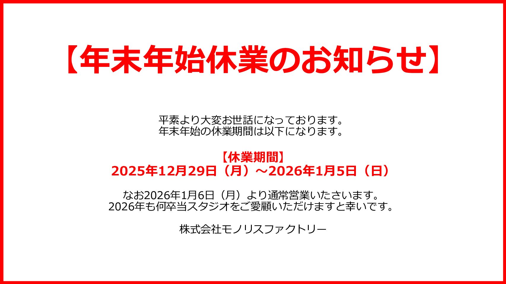 平素より大変お世話になっております。 誠に勝手ながら下記日程で年末年始休業をいたします。 2025年1月29日(月)〜2026年1月5日(日) なお2026年1月6日(月)より通常営業いたさいます。 2026年も何卒当スタジオをご愛顧いただけますと幸いです。 株式会社モノリスファクトリー